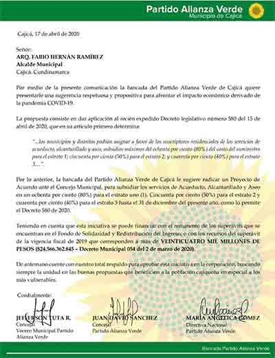 La bancada del Partido Alianza Verde en Cajicá radicó una propuesta al alcalde Fabio Ramírez para generar un alivio en el bolsillo de los hogares cajiqueños.