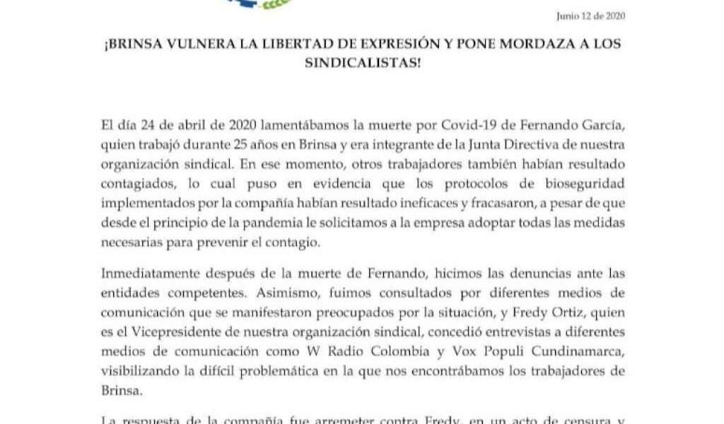 «La respuesta de la compañía fue arremeter contra Fredy, en un acto de censura y persecución sindical. La empresa pretendía que fuéramos cómplices de su incompetencia, al no garantizar ambientes de trabajo libres de Coronavirus», dice el comunicado.