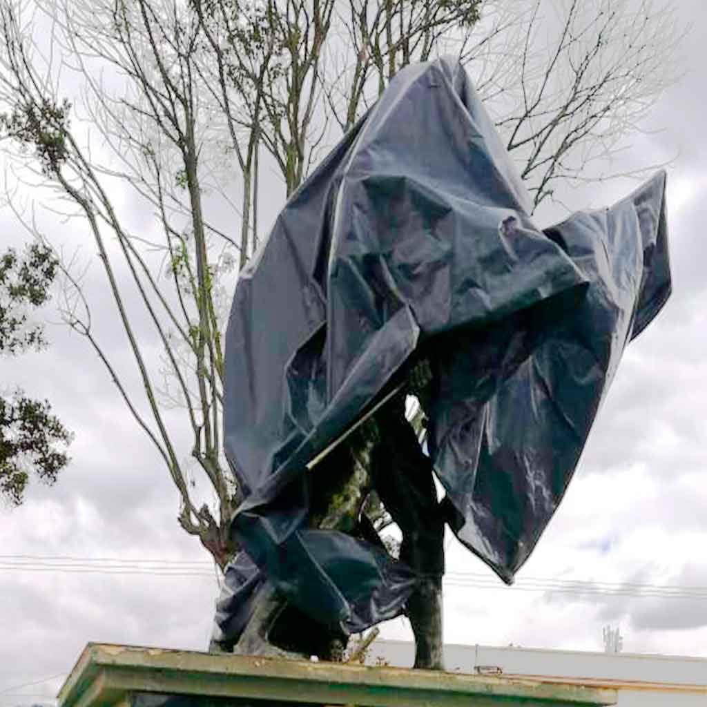 El sitio donde se está instalando el pedestal, en la mitad de la plaza, está encerrado en polisombra, y la escultura de los soldados tapada con plástico negro.