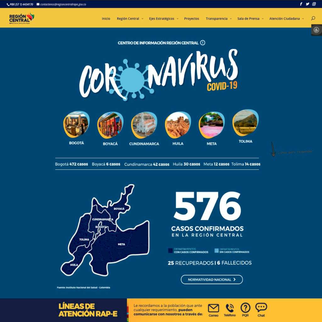 Con el objetivo de concentrar la información sobre COVID-19 en la Región Central, compuesta por los departamentos de Boyacá, Cundinamarca, Huila, Meta y Tolima, y Bogotá, la oficina de comunicaciones de la RAP-E, creó una nueva sección en su portal web: regioncentralrape.gov.co.