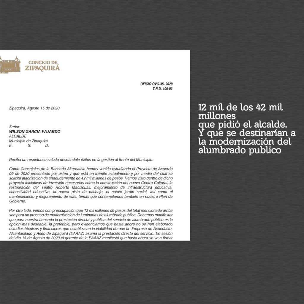 Los concejales de Zipaquirá Felipe Durán, Juan Gutiérrez y Eduard Sarmiento, enviaron un oficio en el que le solicitaron al alcalde Wilson García el 15 de agosto, que se aplace la discusión del endeudamiento de los 12 mil millones solicitados para el cambio de luminarias de alumbrado público.
