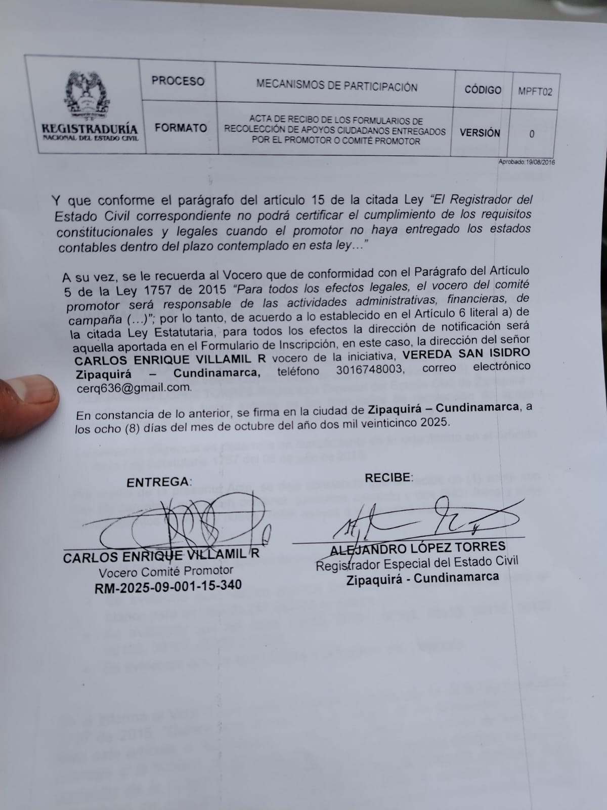 La entrega fue materializada por Carlos Enrique Villamil R., vocero del comité promotor de la iniciativa, quien presentó tres carpetas con los formularios diligenciados. El material fue recibido por el registrador Alejandro López Torres, según consta en el acta No. 63 del 8 de octubre de 2025.