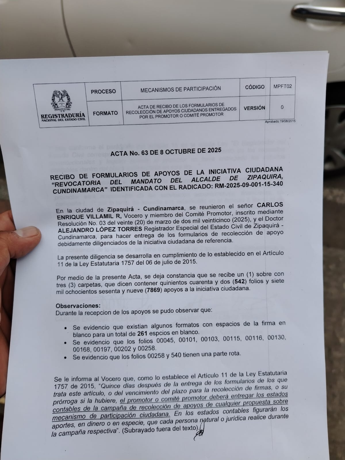 El proceso de revocatoria de mandato del alcalde de Zipaquirá, Fabián Rojas, dio un paso importante este miércoles 8 de octubre con la entrega oficial de 7.869 firmas ante la Registraduría Especial del Estado Civil de Zipaquirá.